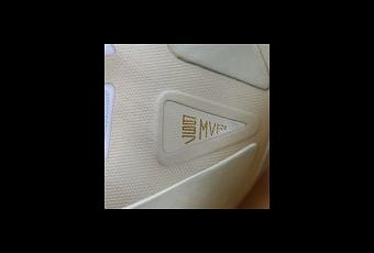 Sur le côté droit de la sneaker, on retrouve « MVP » ainsi que le nombre de points marqués par LeBron lors des playoffs. Sur le côté gauche, se trouvent le terme « CHAMP » et le record de la team en playoffs. The font mimics traditional ring inscription.