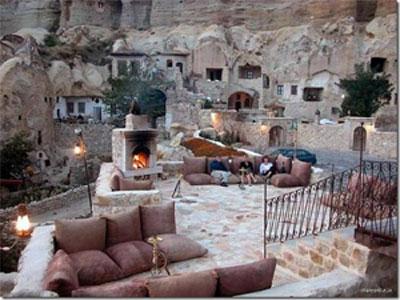 En Cappadoce, dans l'antique village d'Urgup, il existe un luxueux hôtel sculpté dans la montagne et surplombant une falaise, le Yunak Evleri. L'hôtel comprend six appartements situés dans des grottes, 30 chambres datant des 5ème et 6ème siècles, et un manoir du 19e siècle grec. Yunak Evleri est aussi un point de départ idéal pour partir à la découverte de la Cappadoce, une région de la Turquie parsemée de villes souterraines, des églises cachées dans des cavernes.. Un véritable pays de contes de fées.. www.yunak.com
