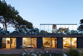 A l’abri des regards, cette maison moderne, contemporaine est blottie dans les pinèdes escarpées du littoral breton, près de Douarnenez (Bretagne Sud). Face à la baie, l’architecture, pensée par Tania Urvois, mise sur des jeux de transparence, de miroir et de camouflage. La maison, sur deux niveaux, ne se révèle pas facilement. Depuis l’entrée de la propriété, vous n’apercevez qu’un pavillon en verre, “bloc” dans lequel se trouve la grande pièce commune et la cuisine, puis à l’étage inférieur, les chambres.