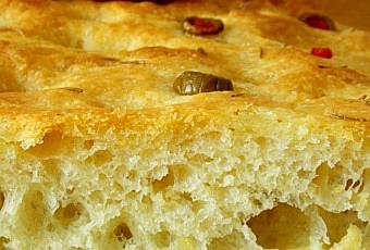J'ai choisi une focaccia au romarin et olives, mais on peut utiliser d'autre herbes et même des oignons. La spécificité de ce pain italien est bien entendu l'huile d'olive, avant d'enfourner la focaccia on l'arrose d'huile d'olive dans laquelle on aura infusé nos herbes.