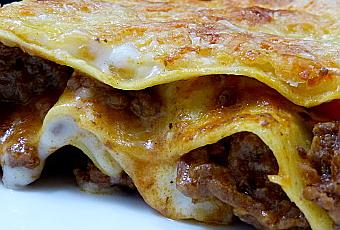 Pour un grand plat de lasagnes, il vous faut : 1 kg de viande hachée, 4 carottes, 1 oignon, 1 branche de céléri, huile d'olive, sauce tomates maison, 1 cube de bouillon de boeuf, 50 gr de beurre demi-sel, 50 gr de farine, lait, muscade, sel, poivre, des lasagnes fraîches, du parmesan, du comté râpé, 1 verre de vin rouge.
