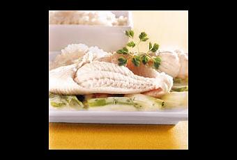 - Placer les filets sur les oignons et faire cuire à couvert environ 5 mn. Retirer les filets du feu. Ajouter la crème fraîche aux oignons, saler et poivrer. Incorporer le cerfeuil haché. Dresser les filets de poisson sur le lit d'oignons. Accompagner de riz.