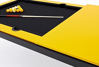 La table a des lignes très pures et est exclusivement composée de matériaux nobles et réalisée par des artisans belges hautement qualifiés. Le rendu précis de la couleur Jaune emblématique de la maison a fait l’objet de recherches. La série de boules de billard jaunes est aussi une exclusivité