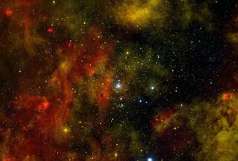Magnifique image composite capturée dans plusieurs longueurs d’onde par les télescopes spatiaux Chandra (rayonnement x), Spitzer (rayonnement infrarouge) et le télescope terrestre Isaac Newton (visible). On peut admirer au milieu des lambeaux de nuages moléculaires, déchirés, creusés et érodés, l’influence de l’amas d’étoiles stellaire Cygnus OB2. Situé à environ 5 000 années-lumière de nous (en direction de la constellation du Cygne), il est peuplé en grande majorité d’étoiles des familles spectrales (type spectral) O et B, massives et très chaudes ! Sur les 1 700 sources détectées dans le rayonnement x par le satellite Chandra, environ 1 500 appartiennent aux étoiles de l’essaim : 60 ont été identifiées pour la catégorie O et 1 000 pour la catégorie B. Les chercheurs souhaitent comprendre la formation et l’évolution de ces attroupements d’étoiles particulièrement massifs. Celui-ci est impressionnant, il équivaut à 30 000 fois la masse du Soleil ! Peuplé d’étoiles très jeunes, âgées de 1 et 7 millions d’années, certaines ont déjà brulées toutes leurs réserves d’hydrogène et explosées en supernova ! Ce qui n’est pas sans conséquence sur l’environnement et la nébuleuse qui les a vu naitre. Le sondage réalisé dans l’infrarouge avec le télescope Spitzer montre que peu d’étoiles de l’amas sont ceintes de disques de poussières.