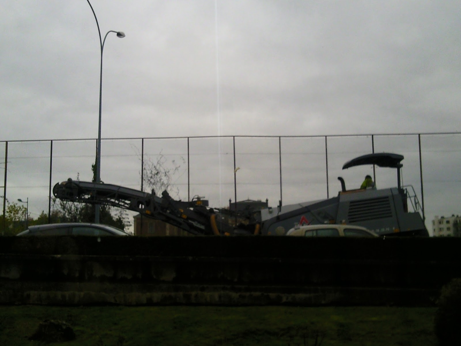 Le truc m'a passionné pendant la moitié de la journée (pendant mes pauses, s'entend): ils ont entamé la réfection d'une portion de route devant mon boulot. Alors qu'au matin tout était calme, sont arrivés d'immenses engins dont la fraiseuse de route, qui comporte un bras immense bien utile: la machine marche comme une grosse décapeuse thermique, et gratte ensuite la route pour la "racler" en profondeur, et la réduire en poussière qu'elle expulse via le bras, dans un camion benne. Ce truc, puissant, est magique. Ça m'a hypnotisé...La fraiseuse en déplacement, depuis ma fenêtre
