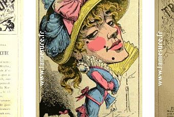 Le Trombinoscope de la fin du XIXe siècle. Sur la première on remarque l’usage des mouches sur le visage et du rouge sur les joues comme au XVIIIe siècle. Sur la seconde, l’ombre de la