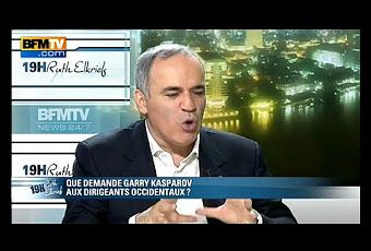 Kasparov est sur tous les grands médias Français Après Europe 1, voici l'interview qu'il a donné à Ruth Elkrief sur BFM. Constitué de plusieurs articles de Kasparov publiés dans diverses revues, son livre Poutine Echec et mat est l'occasion de marquer encore son opposition au dirigeant Russe Poutine. Alors que l'affaire des Pussy Riot provoque encore des remous, les éditions de L'Herne ont voulu miser sur des textes courts, raccords avec l'actualité.