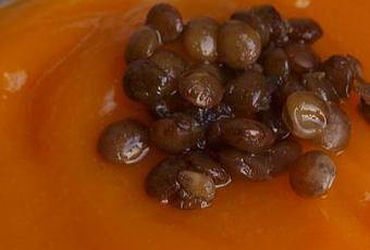 Faire un sirop parfumé avec 20 cl d’eau, le sucre, la vanille et la badiane. Y ajouter les lentilles et laisser encore mijoter très doucement une heure.