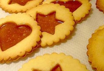 9. Sortez les biscuits du four e tremplissez chaque partie évidée avec les petits morceaux de caramel. Remettez les biscuits au four 8 minutes environ. Laissez-les complètement refroidir avant de les decoller du papier de cuisson.