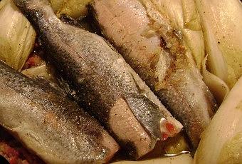 3) Couper la tête des truites, les faire dorer dans une poêle avec un peu de matière grasse. Saler, poivrer
