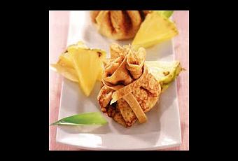 - Mettre au milieu de chaque crêpe une ou deux cuillerées de purée de fruits. Relever les bords de la crêpe et former une bourse. La fermer avec une lanière de crêpe. Procéder de la même façon avec les autres crêpes.