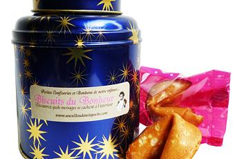 Cette jolie boite en métal (que se recycle en boite à thé...) contient de délicieuses crêpes (biscuits fabriqués en France) qui cachent en leurs centres un message, une citation...