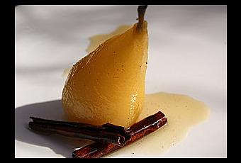 Dresser les poires dans des assiettes, arroser avec le sirop et décorer avec les épices.