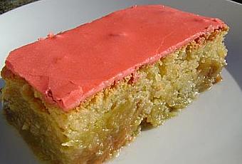 Ce ne sera pas une tarte cette fois-ci mais un fondant auquel j’ai largement substitué la farine à de la poudre d’amande. Pour le plaisir, j’y ai rajouté un petit glaçage rose bonbon pour rappeler la teinte rosée de la rhubarbe lorsqu’elle cuit… Un vrai régal.