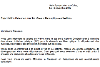 Vous trouverez ci-après une lettre envoyée au Président du Conseil Général des Yvelines par Thomas Gassiloud, PDG de Wibox, opérateur de télécommunications notamment en fibre optique. Comme vous le savez peut-être, les élus du CG 78 ont pris la décision de fibrer tout le territoire du département, la partie dense (côté Paris), ainsi que la partie rurale (côté New-York)..