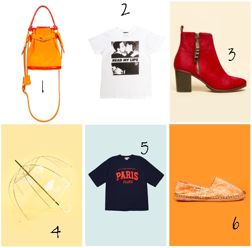 1. Pop-Up Mini Bucket Bag (Opening Ceremony) : 450 $2. Act Up - Read My Lips Tee (Opening Ceremony) : 50 $3. Shirley Pony Boots (Opening Ceremony) : 485 $4. Seventies Umbrella (Opening Ceremony) : 55 $5. Exclusive Paris Sweatshirt (Opening Ceremony) : 75 $6. Soludos Espadrille - Cork (Opening Ceremony) : 35 $