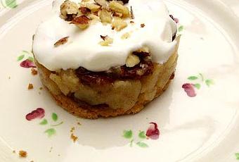 Préchauffez le four à 200C. Mettez les raisins à macérer dans le rhum. Mélangez la farine, le sucre, l'œuf et l'extrait de vanille. Ajoutez le beurre et pétrissez la pâte. Farinez le plan de travail et abaissez la pâte au rouleau. Sur un morceau de papier sulfurisé, disposez les sables que vous aurez formes avec un emporté pièce rond. Enfournez pendant 20 min. Pendant ce temps, pelez les pommes et coupez-le en petits dés. Faites fondre le beurre dans une casserole et faites y revenir les pommes. Ajoutez un fond d'eau et faites comporter. Ajoutez la cannelle et le gingembre. À la fin de la cuisson, quand les pommes sont bien ramollies et fondues, ajoutez les raisins et le sucre. Mélangez bien. À l'aide d'un emporte-pièce, disposez le sable, la compotée de pommes, puis une couche de noisettes et enfin, finissez par une cuillère à soupe de yaourt pour ajouter de l'onctuosité. Retirez doucement l'emporte-pièce.