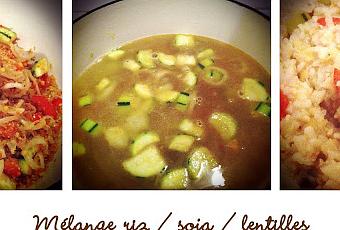 Dans la cocotte en fonte rouge, j'ai fait revenir 2 oignons, 2 courgettes et 2 tomates. Une fois le tout joliment doré j'y ai ajouté un mélange de céréales (riz/soja/lentilles) et j'ai bien mélangé le tout et j'ai ajouté dans la cocotte 2 fois le volume d'eau des ingrédients déjà présent dans le contenant. Et ensuite j'ai attendu que l'eau ait été absorbée et voilà : une bonne potée comme on les aime en cette saison.