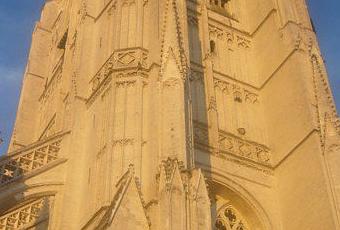 La tour de la cathédrale de Saint-Omer éclairée par le soleil couchant du mois d'août