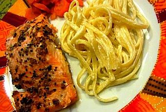 Plus une idée d'association qu'une recette, ce saumon trappeur est ultra savoureux. La cuisson en papillote est ma préférée pour le côté fondant. Avec les épices "Mélange du trappeur"(pépites de sucre d’érable, sel de mer, ail, oignon, poivron rouge, poivre, coriandre) (c'est la marque Terre Exotique qui fait ça, et je ne suis pas sponsorisée ;) ), c'est tout simplement succulent! Je l'ai servi avec des linguini à la crème et fond de poisson, et des carottes vapeur. Le saumon contient beaucoup d'Omega 3 et de vitamine D dont nous manquons BEAUCOUP, surtout en ce moment. A consommer sans modération donc :)