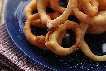 7- Trempez les rondelles d’oignons une à une dans la pâte à beignet et plongez-les dans l’huile. Allez-y petit à petit, 5 à 6 rondelles à la fois.