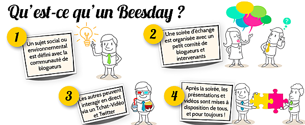 Comme vous l'avez sûrement compris grâce à cette petite illustration mignonne tout plein, un Beesday, c'est une rencontre organisée autour d'une problématique écologique ou citoyenne et destinée à faire réfléchir des gens (blogueurs, lecteurs, représentants des marques).