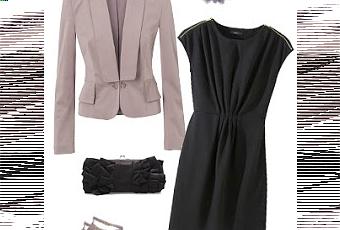 Robe Caroll (95 euros), veste Esprit (139,95 euros), chaussures San Marina (85 euros), pochette Oh my Shop (34 euros) et broche Promod (6,95 euros) style sophistiqué: