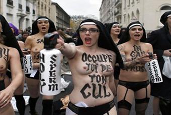 La manifestation contre le mariage gay, lancée par l’association catholique Civitas, avait réunis près de 8 000 personnes. En queue de manifestation, les femens étaient venues contre-manifester déguisées en bonne soeur. Mais lorsqu’elles ont retirées leurs vêtements pour laisser apparaître les slogans inscrit sur leurs poitrines, les opposants au mariage gay s’en sont prises à elles violemment.