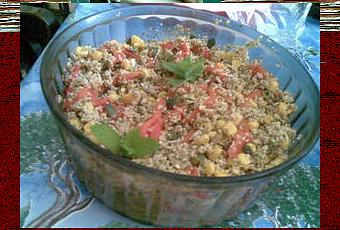 Dans un robot, mettre une tomate épépinée, un poivron épépiné, un bouquet de feuilles de menthe, un oignon coupé en quartiers. Broyer de manière pas trop fine. Y rajouter une boîte de grains de maïs. Ajouter cette mixture à la semoule et assaisonner d'un jus de citron, de sel, de poivre. Décorer avec quelques feuilles de menthe entières.
