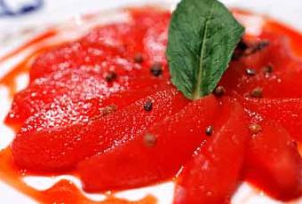 Deux possibilités s’offrent a vous : vous dresser les poires debout, vous les arroser du sirop épicé, vous décorer de menthe et de bâton de cannelle. ou vous émincer les poires de bas en haut ( photo du haut ) en laissant la queue et dresser sur assiette en rosace. Napper du sirop et décorer.