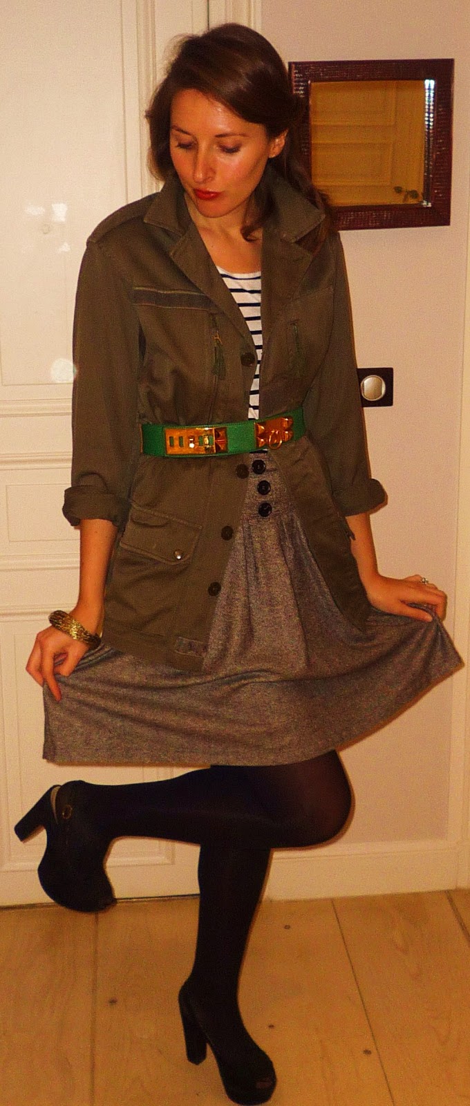 Veste vintage (Surplus Doursoux), T-shirt H&M, Jupe Iro, Ceinture Hermès, Chaussures Mango, Bracelets rapportés des Landes, Bague offerte par Christy