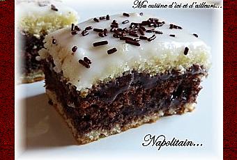 Bonjour, je reste dans le fait maison en ce moment et j'ai choisi le Napolitain maison... Dans le cadre d'un tour en cuisine, j'ai trouvé la recette chez Babychocolate... Un vrai délice !!! C'est au tour du blog "une cuisine pour Voozenoo" de se servir sur mon blog... Pour 10 parts, il vous faut: 1 yaourt (le pot sert de doseur) 2 pots1/2 de sucre 1/2 pot d'huile 4 oeufs 4 pots de farine 1/2 sachet de levure 9 cuillères à soupe de cacao amer 1 cuillère à café de vanille en poudre 14 cuillères à soupe de lait concentré sucré 180 gr de sucre glace Vermicelles en chocolat Mélangez le yaourt, le sucre, l'huile, les oeufs, la farine et la levure, puis divisez la pâte en 2. Incorporez la vanille dans une des 2 parties puis 3 cuillères à soupe de cacao dans l'autre. Faîtes cuire les 2 pâtes 15 minutes à 180°. Pendant la cuisson, préparez la crème au cacao, pour cela, mélangez le lait concentré avec le reste de cacao. Superposez les couches de biscuit en les collant avec la crème en alternant une couche de biscuit vanille, crème, biscuit chocolat, crème et finir par le biscuit vanille. Préparez le glaçage en mélangeant le sucre glace avec 6 cuillères à soupe d'eau. Étalez-le sur la gâteau à l'aide d'une spatule. Parsemez de vermicelles en chocolat et placez le tout au réfrigérateur jusqu'à ce que le glaçage ait durci. Découpez les parts en prenant soin d'essuyer le couteau entre chaque coup de couteau... Bonne dégustation...