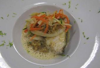 Filet de flיtan, jus de coquillages, salade de lיgumes croquants en aigre-doux et quinoa