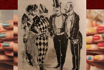 l'Almanach du Charivari pour 1892. Deux femmes en habit de bal de carnaval s'adressent à deux Messieurs qui leur répondent : « Une po'ka ? Est-ce que vous vous f...ichez dans