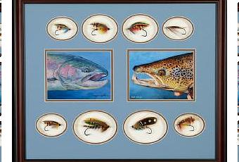 Le lot contient une canne à deux mains personalisé et deux peintures originales avec des mouches à saumon en ornement. La vente s’arrête ce soir.