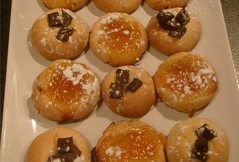 Entreposer au frais 10 minutes, ensuite faire des petites boules les applatir légérement faire un petit puits avec un doigt y mettre la garniture choisie