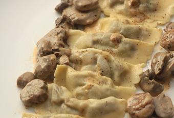 Servir les ravioles accompagnées de champignons aux marrons à la crème.