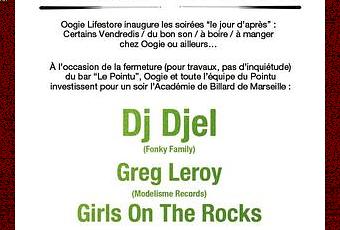 Alors ce soir, on laisse tomber la couette et la tisane et on part s'évader dans les rues de la Cité massilienne pour un happy Marathon des Sorties. Visionnaires très festifs la tribu de chez Oogie et le Pointu Bar on décidé de jouer la carte du JOUR D'APRES dans l'antre très secrète de l'Académie de Billard (26 rue Pavillon 1er) de 20h à 2h du matin. Entrée gratuite pour tous (avec petite restauration sur place) et derrière les platines 3 DJ's prêts à faire trembler les ondes de la fin du monde DJ DJEL (Fonky Family), GREG LEROY (Modelisme Records) et le duo bien aimé des GIRLS ON THE ROCK ! Un nouveau rendez-vous du vendredi version bon son, à boire et à manger sans modération !