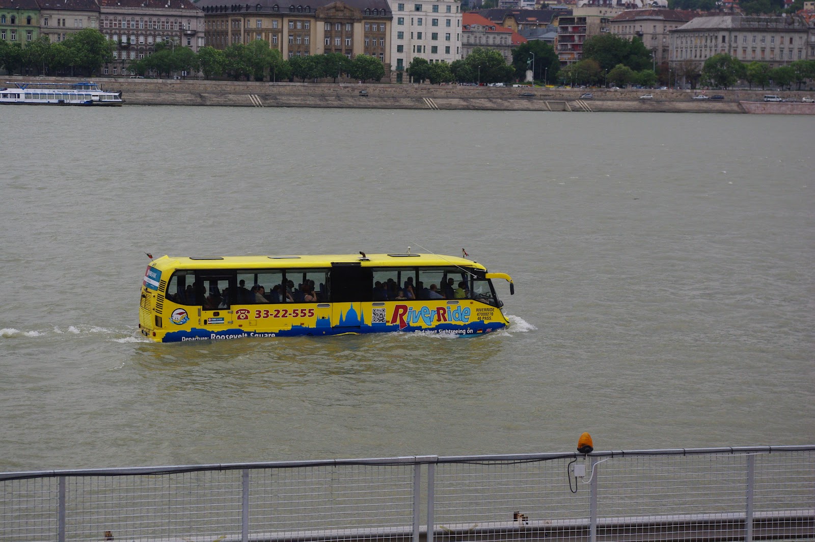 1- A Budapest comme dans de nombreuses villes, on fait des travaux. Et ici les ouvriers portent consciencieusement casques et chaussures de sécurité. Nous sommes côté Pest, au bord du Danube. Le Danube, dont tout le monde sait qu'il est beau et bleu depuis Johann Strauss, prend sa source dans la Forêt Noire avec la rencontre de deux autres cours d'eau, et mesure... Eh mais oh ! C'est quoi ce truc jaune dans le Danube ? 2- Mais oui les monopèdes, on dirait... mais... c'est... c'est... un BUS ! 3- C'est officiel : on a retrouvé le Bus Magique ! Il est garé à Budapest.