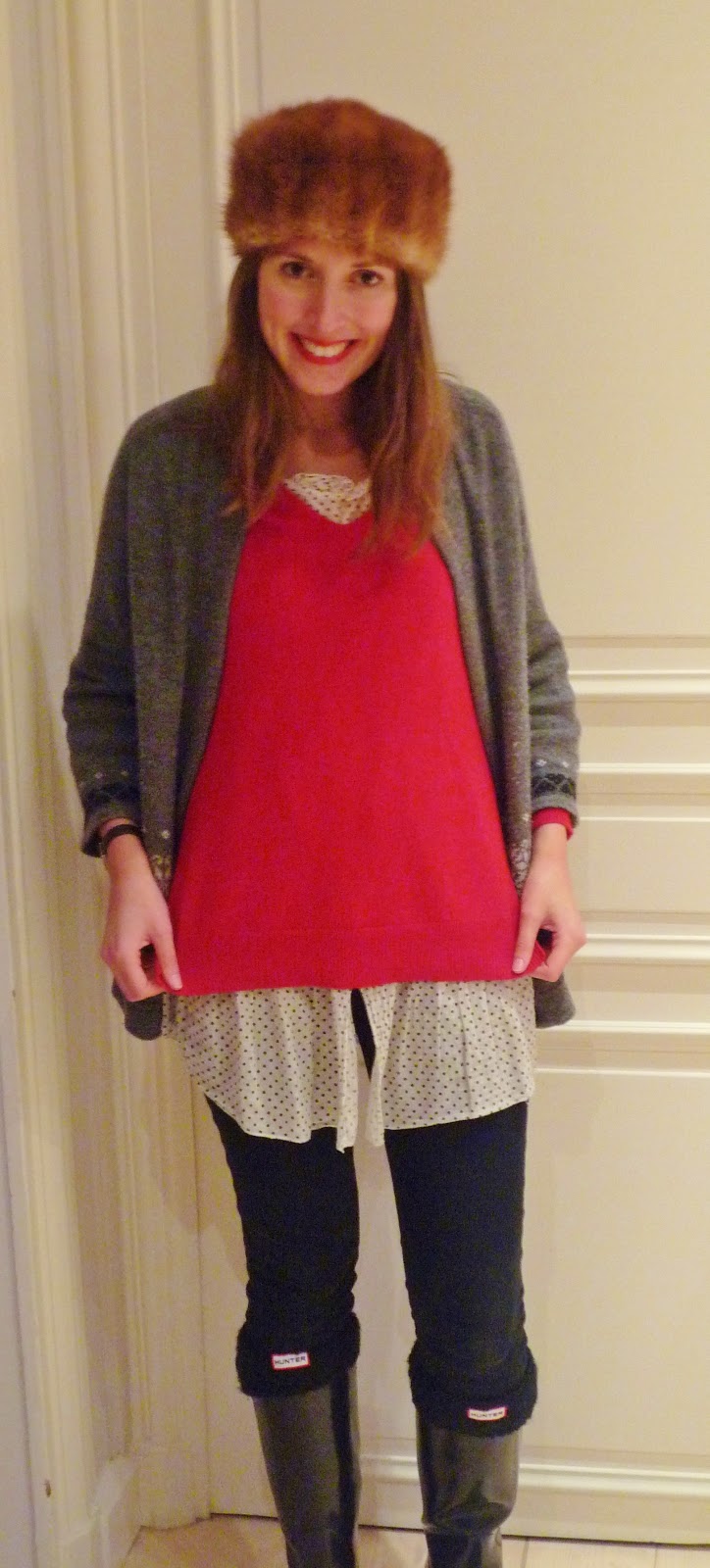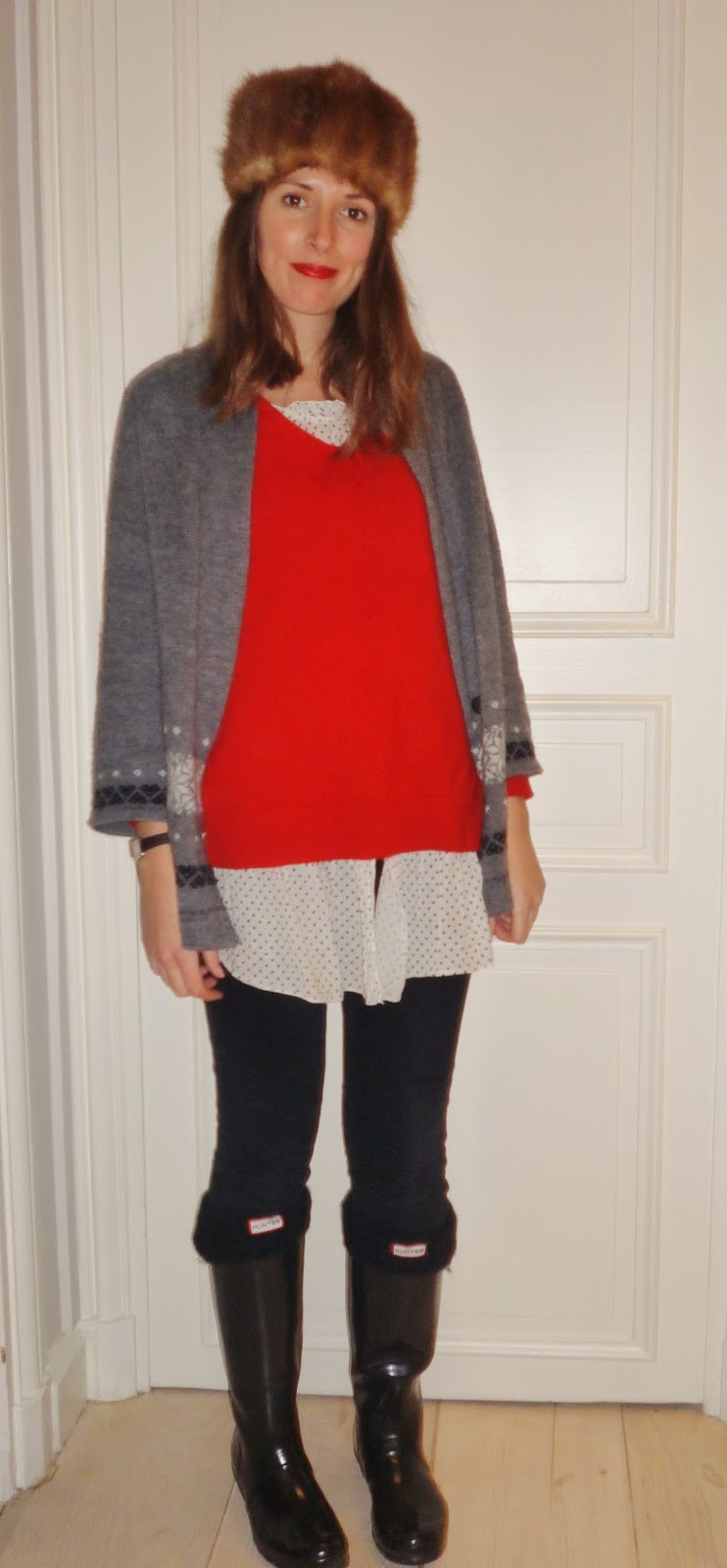 Je porte une chapka vintage, un gilet Sandro, un pull Zara, une tunique Topshop, un jean Cheap Monday, des bottes Hunter et leurs chaussettes de laines