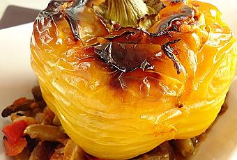 Préparez vos poivrons si ça n'est pas déjà fait. Lorsque le risono et les légumes sont cuits, les mélangez ensemble et en garnir les poivrons. Réservez-les.