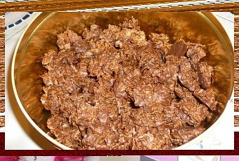 Faire fondre le « NUSSA » dans une casserole à feux très doux, ajouter le sucre glace, les 2 chocolats, bien mélanger l’ensemble, puis ajouter les corn flakes