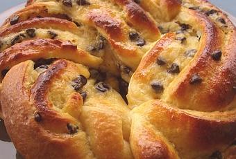 Une fois le programme terminé, sortir le pâton et l'étaler en forme de rectangle. Le recouvrir de crème pâtissière et parsemer de pépites de chocolat