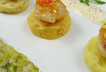 Dresser les trois purées avec les Saint Jacques. Déposer 3 noisettes de beurre parfumé sur les noix. Disposer la fondue de poireaux et le capuccino de Saint Jacques.