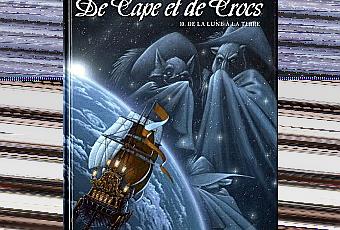 « De la Lune à la Terre » est un album particulier à mes yeux. Il clôt la désormais mythique série « De Cape et de Crocs » née de la collaboration d’Alain Ayroles et Jean-Luc Masbou. Avant de partir à la découverte de ce dernier épisode, je m’étais imposé de lire une nouvelle fois l’intégralité des opus précédents. Cela m’apparaissait indispensable pour profiter pleinement des dernières aventures de nos héros. Ce n’est donc que récemment que je me suis plongé dans cet ouvrage apparu dans les rayons en avril dernier. Toujours édité chez Delcourt, le bouquin nous offrait une couverture pleine de rêve. On y voit un navire flotter dans l’espace pour le voyage final de notre célèbre trio dont on devine le portrait dans le ciel étoilé. Voilà qui ne faisait qu’attiser ma curiosité déjà pas loin d’avoir atteint son paroxysme.