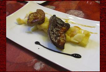 Préparez le foie gras : Poêlez les escalopes de foie gras (poêle chaude, à sec). Baissez un peu le feu. Une fois les escalopes caramélisées sur les deux faces, réservez. Vous les remettrez à cuire, au four, pendant quelques minutes à 200°C. Elles seront cuites lorsque la graisse ressortira et crépitera (à l’oeil quoi ! Ne demandez pas de temps, vous n’en aurez pas!).