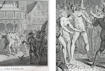 « Adamites d'Amsterdam » Gravure sans doute du XVIIIe siècle représentant probablement une persécution des adamiens. Ceux-ci nus sont encerclés par des