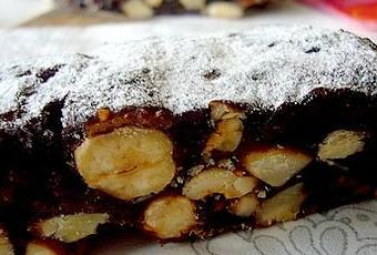 J'ai consulté un certain nombre de recettes de Panforte sur internet et mon choix s'est finalement porté sur celle de Marmiton. Le Panforte est une gourmandise originaire de Sienne qui daterait du moyen-age. Je l'ai fait avec ce que j'avais dans mon placard. Le résultat est une sorte de nougat au niveau de la texture assez sucré à mon goût, donc à consommer en tranches très fines. Bien emballé, il se conserve plusieurs jours et pourra remplacer une barre chocolatée parce-que il n y a que des bonnes choses dedans ! 10 jours après sa confection il est encore meilleur.