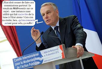En lançant, mardi 18 décembre 2012, un grand audit des politiques publiques qui doit se prolonger sur tout le quinquennat, Jean-Marc Ayrault poursuit la même lune sarkozienne de réduction des dépenses de l’Etat tout en récusant le copier-coller de la défunte « Réduction générale des politiques publiques» (RGPP), qui prévoyait notamment le non-remplacement d'un fonctionnaire partant en retraite sur deux.
