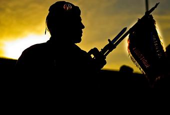 Place d’armes du camp de Warehouse, le 12 novembre 2012. Au petit matin, l’adjudant Hervé, adjudant d’unité (ADU) de l’escadron de circulation et de transport, porte fièrement le fanion aux couleurs de son escadron. Il arbore l’insigne de son arme d’appartenance, l’arme du train, élément majeur du BATLOG dans le désengagement logistique des forces françaises d’Afghanistan.